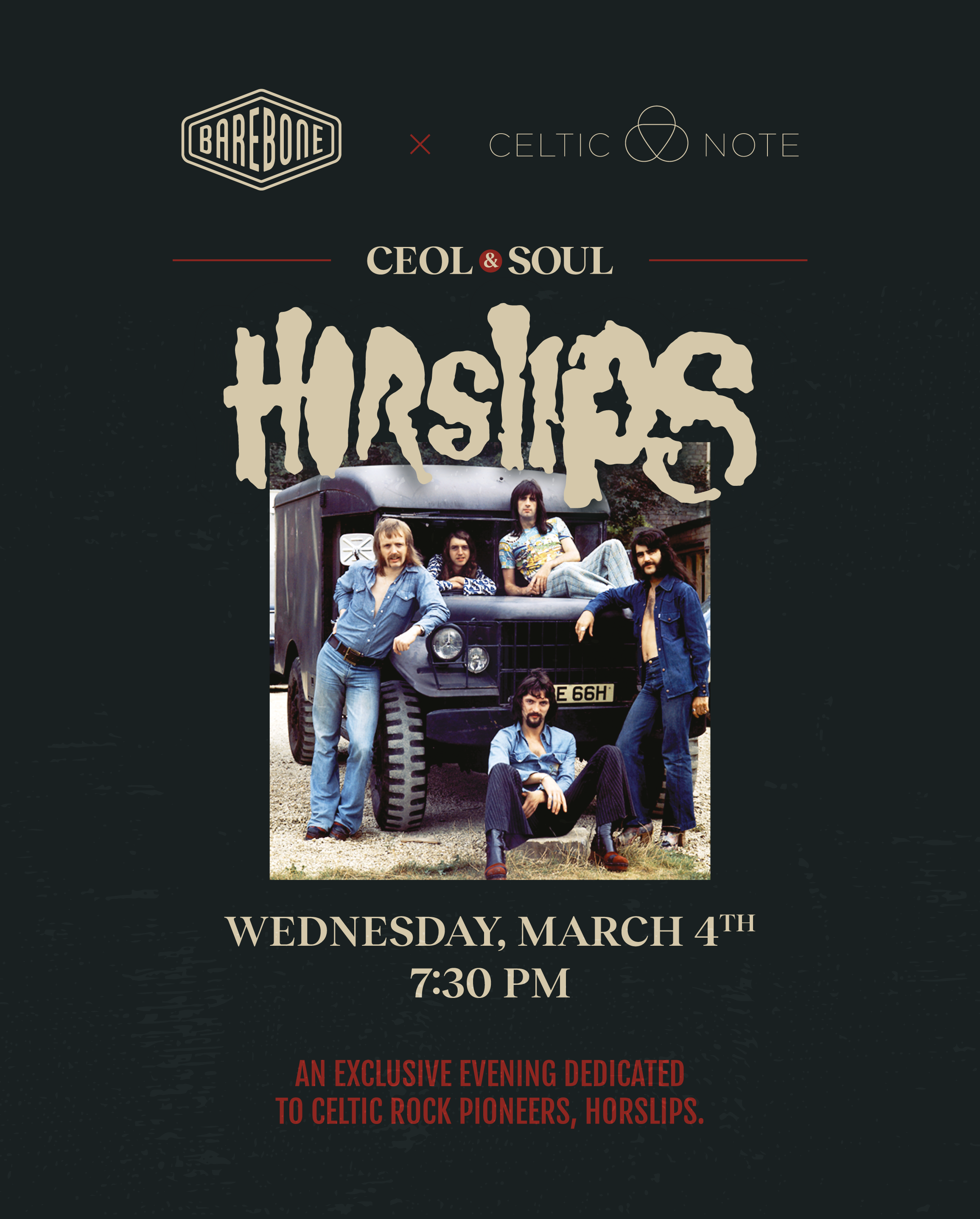 Barebone Announces Immersive Vinyl Residency Celebrating Irish Musical Legends (in association with Celtic Note). Ceol & Soul is a four-part immersive listening series celebrating the heavyweights of Irish music. The series debuts on Wednesday, March 4th at 7:30pm with an exclusive evening dedicated to Celtic rock pioneers, Horslips. Taking place just the day before the band receives the "Classic Irish Album" award at the RTÉ Choice Music Prize, the night will centre around the playback of a newly commissioned, limited-edition solid red vinyl pressing of their masterpiece album, The Táin.